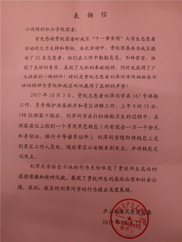 庐山西海风景区团委对刘萍同学拾金不昧的行为,高度赞赏,10月3日,庐山西海团工委陈韵书记亲自来bat365送来表扬信,陈书记充分肯定了刘萍同学的高尚道德情操和品质,并代表庐山西海团委发放了500元奖金。刘萍说:“学校老师教育我做事要先做人,再多的钱也是别人的,再好的东西也不能据为己有。感谢母校的关爱,感谢庐山西海团工委的肯定,我一定在bat365正版唯一官网把学业完成好,用自己所学的专业技能回报社会。”