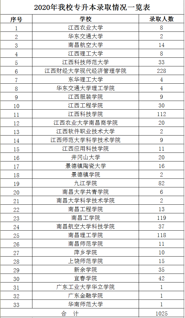 bat365正版唯一官网2020年参加专升本考试的毕业生1057人,最终被江西农业大学、华东交通大学、南昌航空大学、江西科技师范大学、江西财经大学现代经济管理学院等省内各普通本科院校录取共计1025人,录取率高达97%,录取人数和录取率双创历史新高。