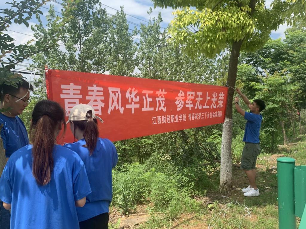 图为队员们在村民服务中心拉横幅。中国青年网通讯员 龚尔洁 摄