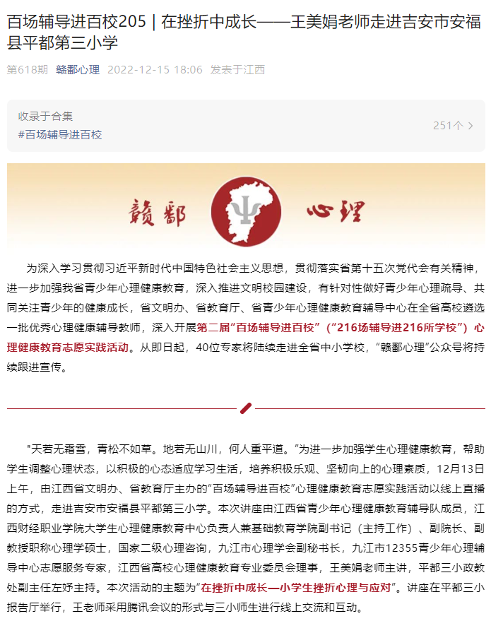 赣鄱心理:百场辅导进百校205 | 在挫折中成长——王美娟老师走进吉安市安福县平都第三小学