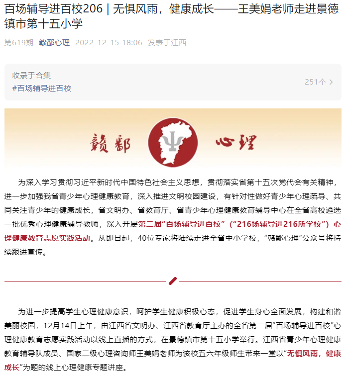 赣鄱心理:百场辅导进百校206 | 无惧风雨,健康成长——王美娟老师走进景德镇市第十五小学