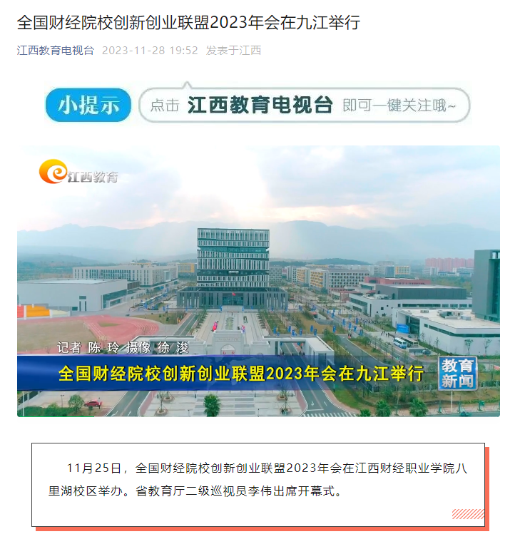江西教育电视台:全国财经院校创新创业联盟2023年会在九江举行