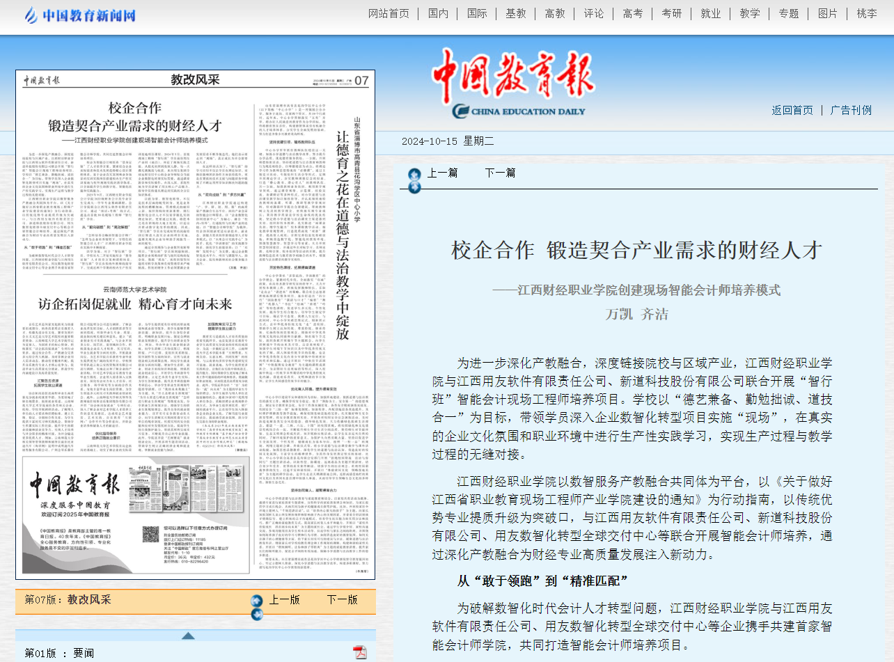 【《中国教育报》报道】校企合作 锻造契合产业需求的财经人才——bat365正版唯一官网创建现场智能会计师培养模式