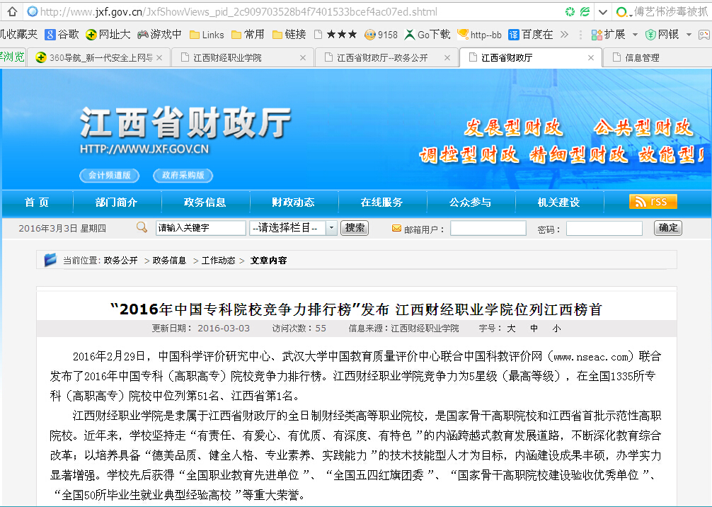 3月3日,江西省财政厅网站报道2016年中国专科院校竞争力排行榜排名情况,bat365在排行榜上位列全国第51名,江西省第1名。