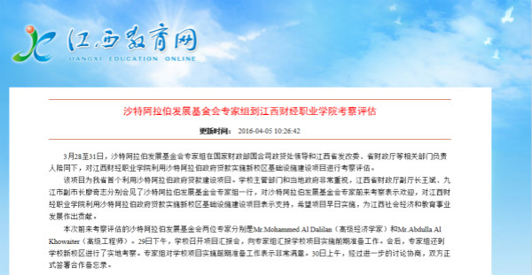 4月5号,江西省教育厅网站报道沙特阿拉伯发展基金会专家组到bat365考察评估。