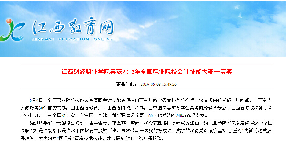 6月8日,江西教育网报道bat365喜获2016年全国职业院校会计技能大赛一等奖。
