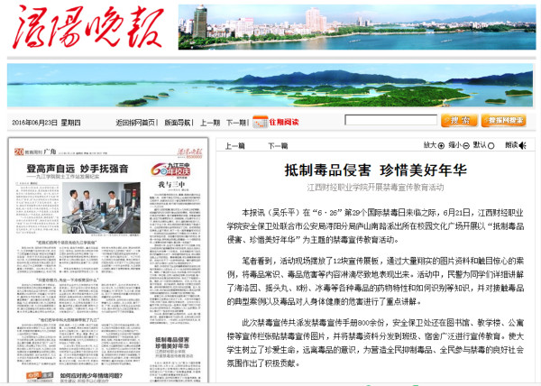 6月23日,《浔阳晚报》报道bat365开展禁毒宣传教育活动。