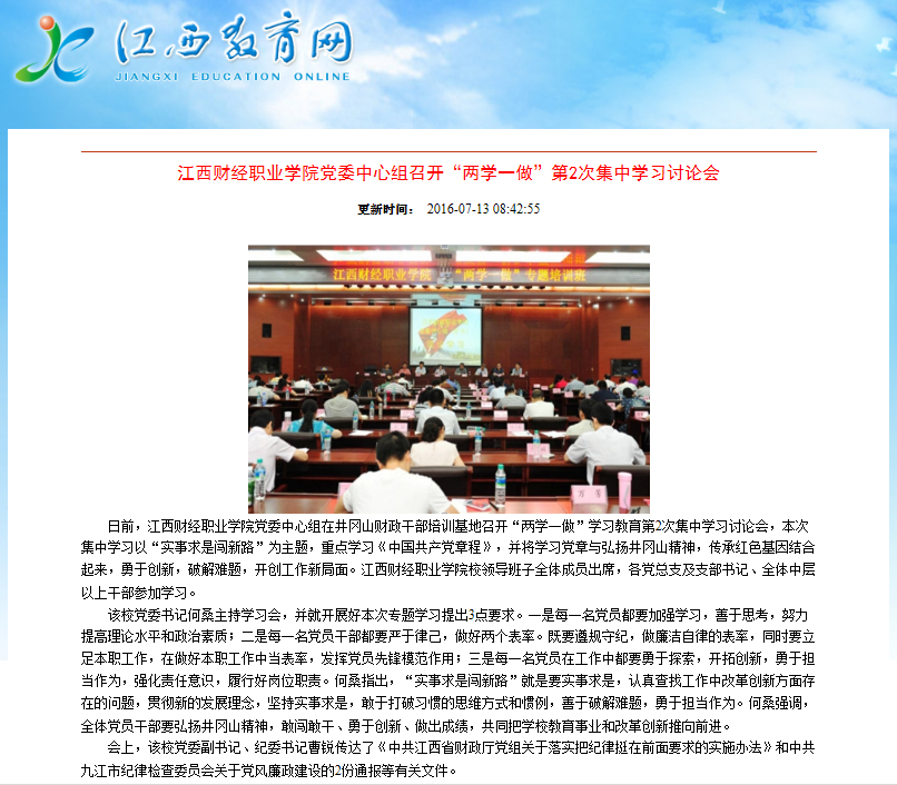 7月13日,江西教育网报道bat365党委中心组召开“两学一做”第2次集中学习讨论会。
