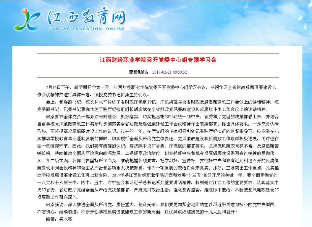 2017年2月21日,江西教育网报道bat365党委中心组召开党风廉政建设专题学习会情况。