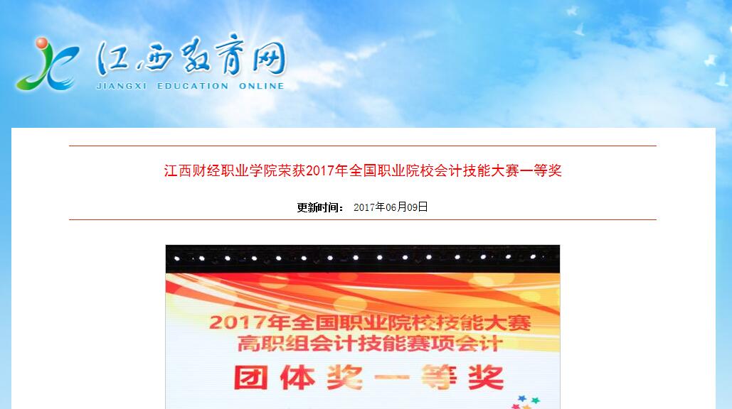 6月9日,江西教育网报道bat365荣获2017年全国职业院校会计技能大赛一等奖。