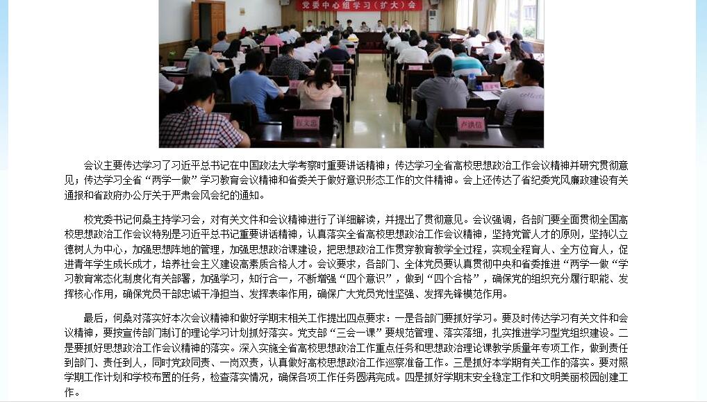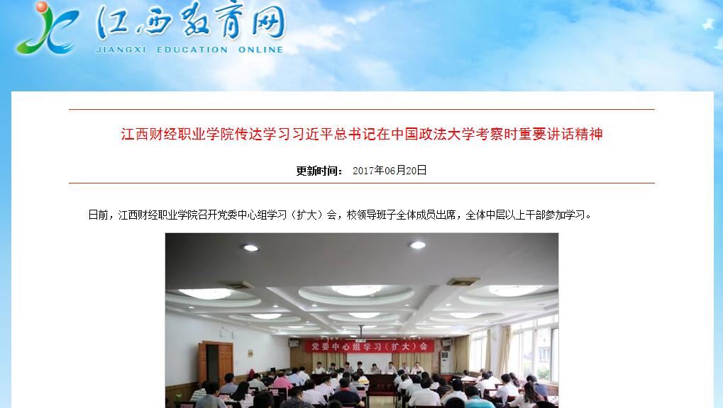 6月20日,江西教育网报道bat365召开党委中心组学习(扩大)会,传达学习习近平总书记在中国政法大学考察时重要讲话精神。