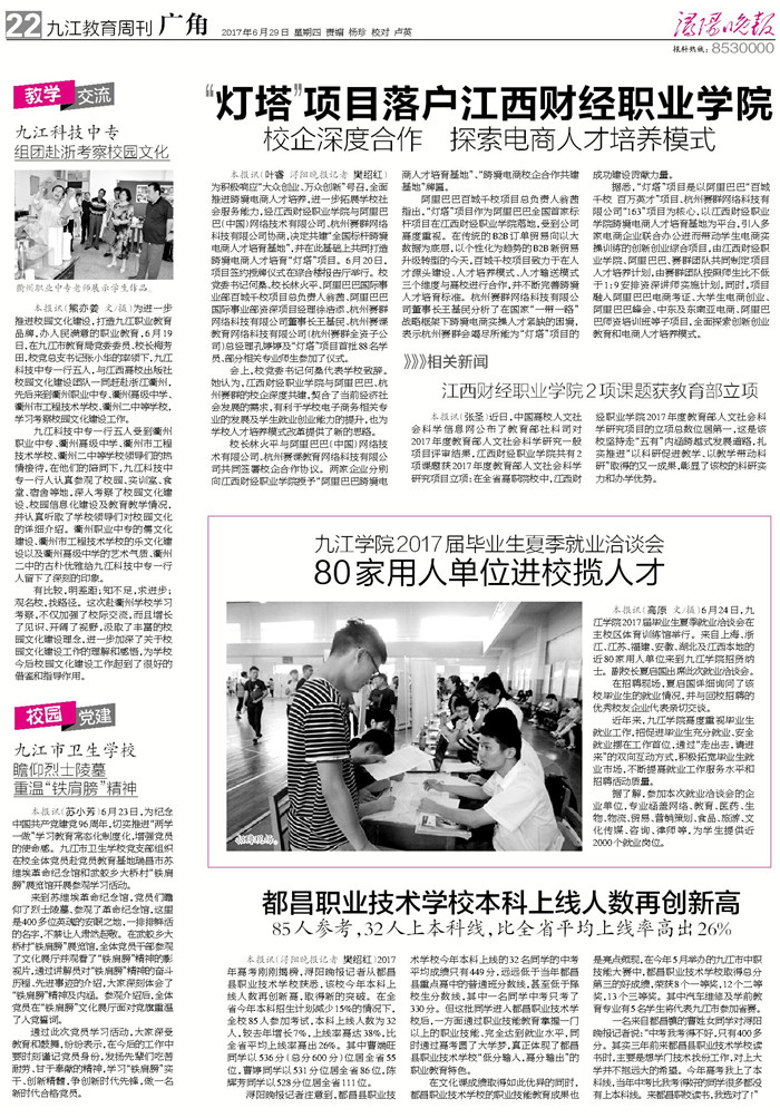 6月29日,浔阳晚报报道bat365与阿里巴巴公司合作实施“灯塔”项目,开展电商人才培养。