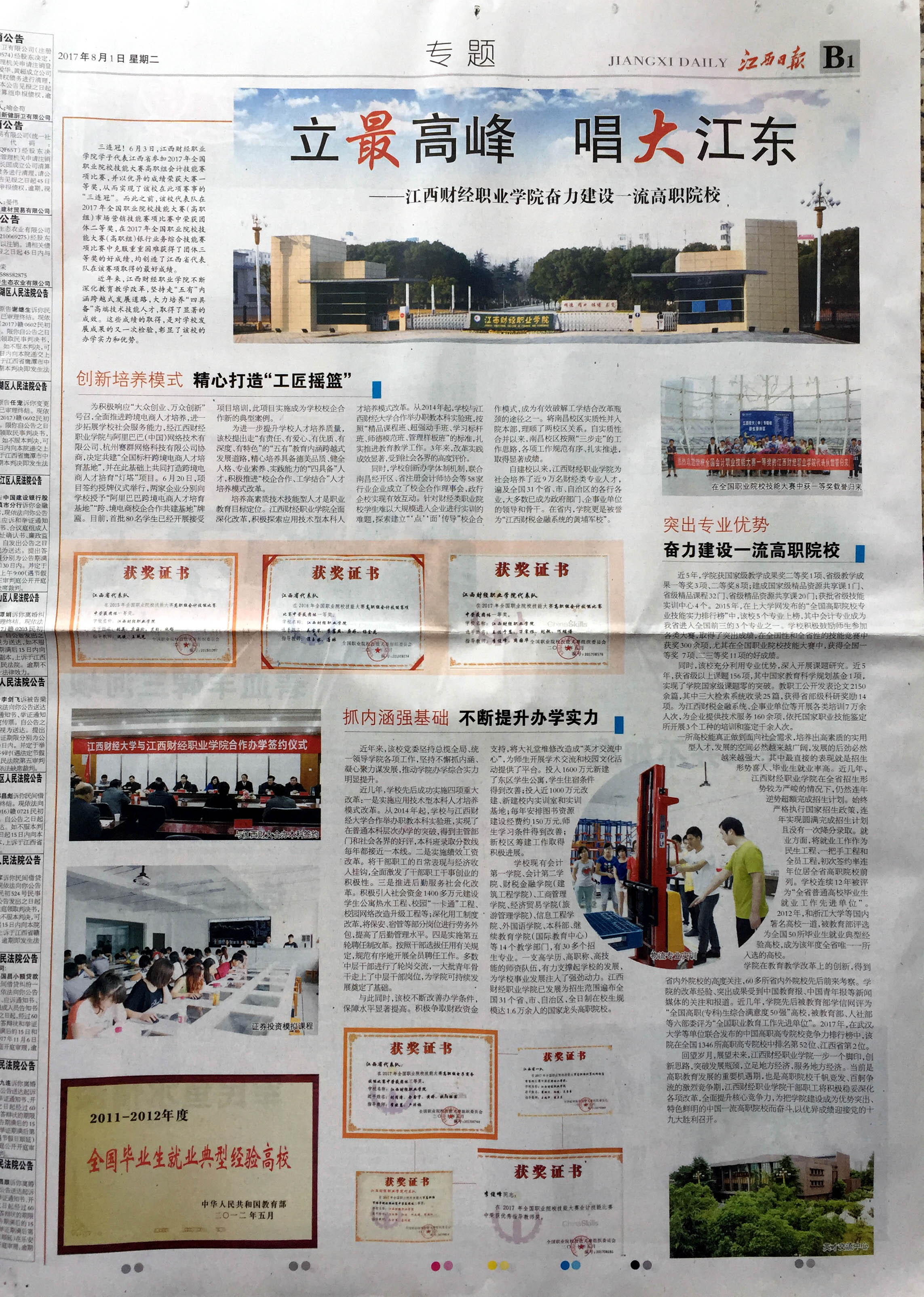 8月1日,《江西日报》B1版刊发《立最高峰 唱大江东——bat365正版唯一官网奋力建设一流高职院校》一文,专题报道bat365大力发展现代职业教育,加强内涵建设,提升综合实力,建设一流高职院校。