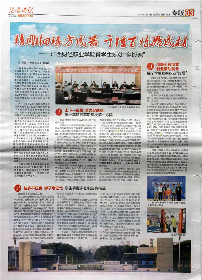 8月3日,《浔阳晚报》第3版刊发《精雕细琢方成器 千锤百炼始成材——bat365正版唯一官网帮学生炼就“金饭碗”》一文,报道我