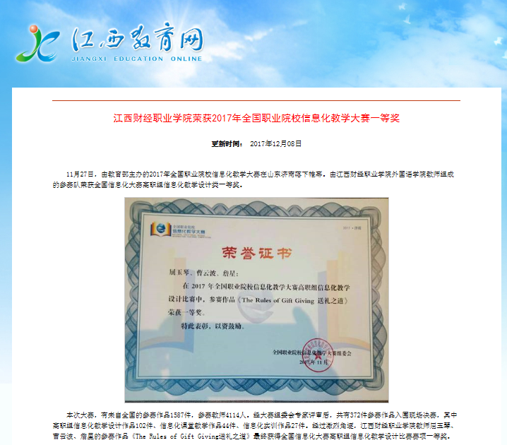 12月8日,江西教育网报道bat365荣获2017年全国职业院校信息化教学大赛一等奖。