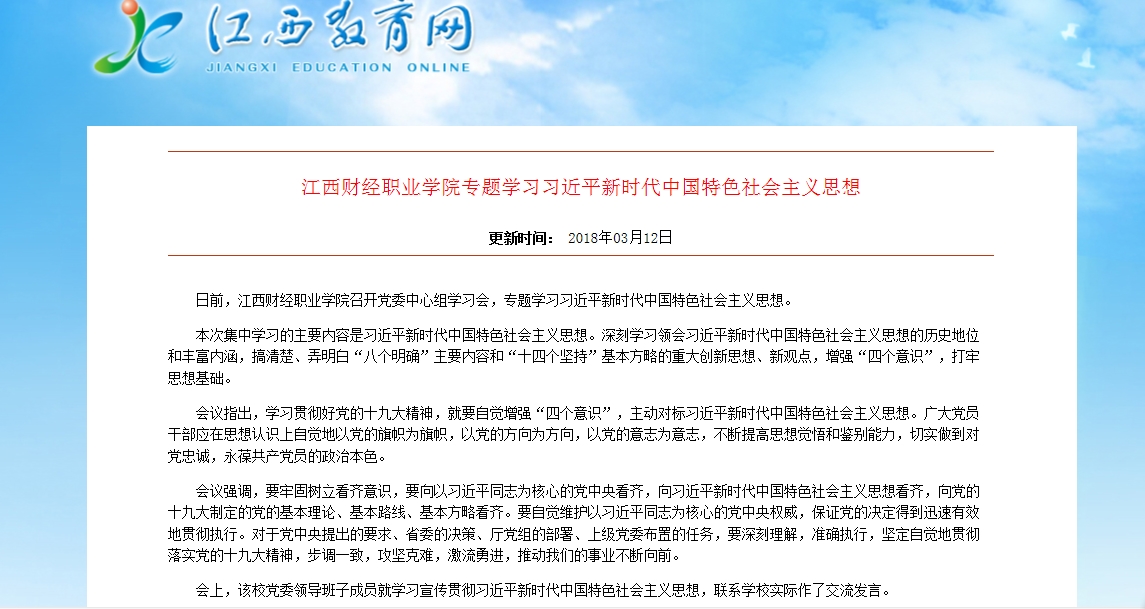 3月12日,江西教育网报道bat365专题学习贯彻习近平新时代中国特色社会主义思想活动。