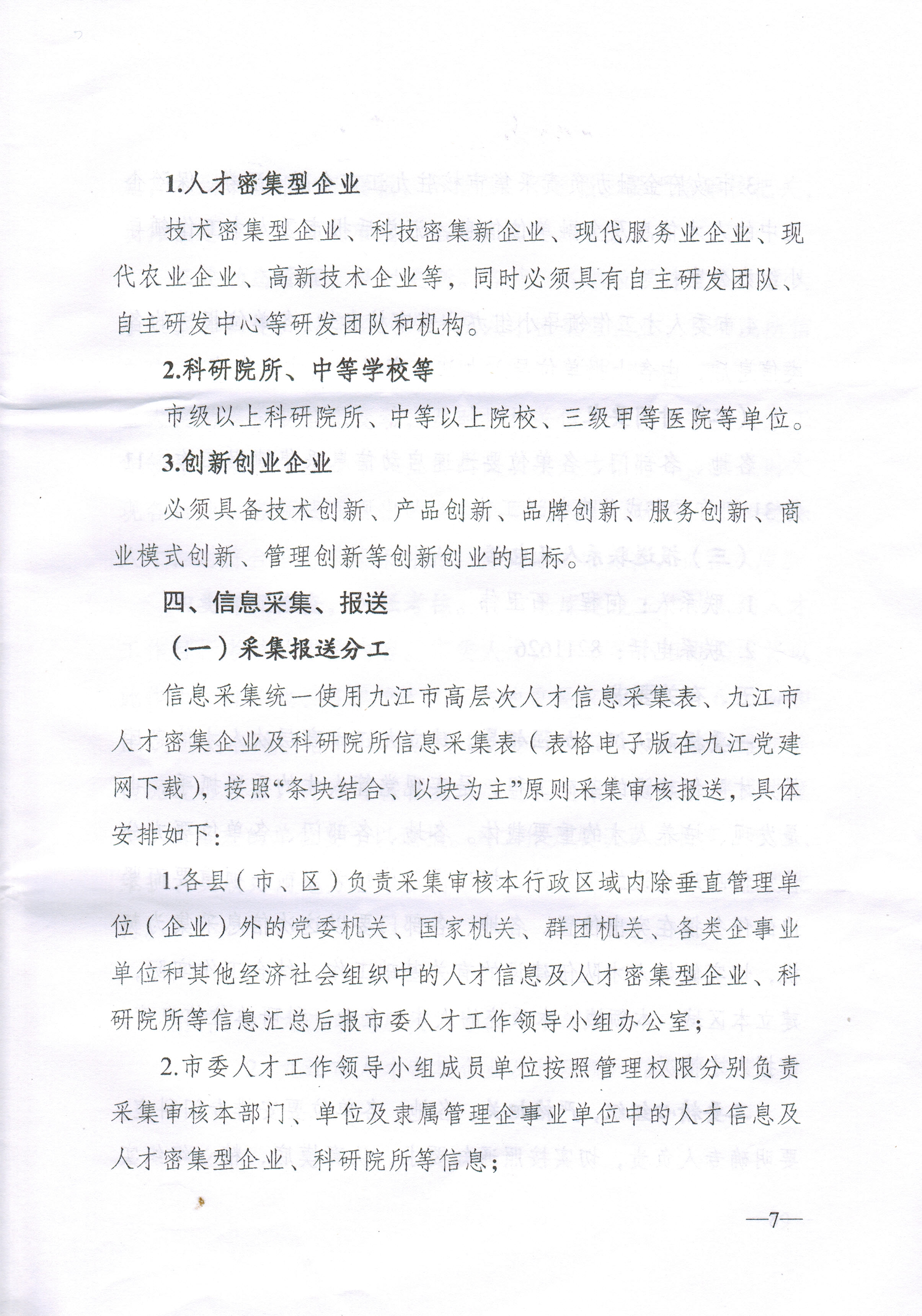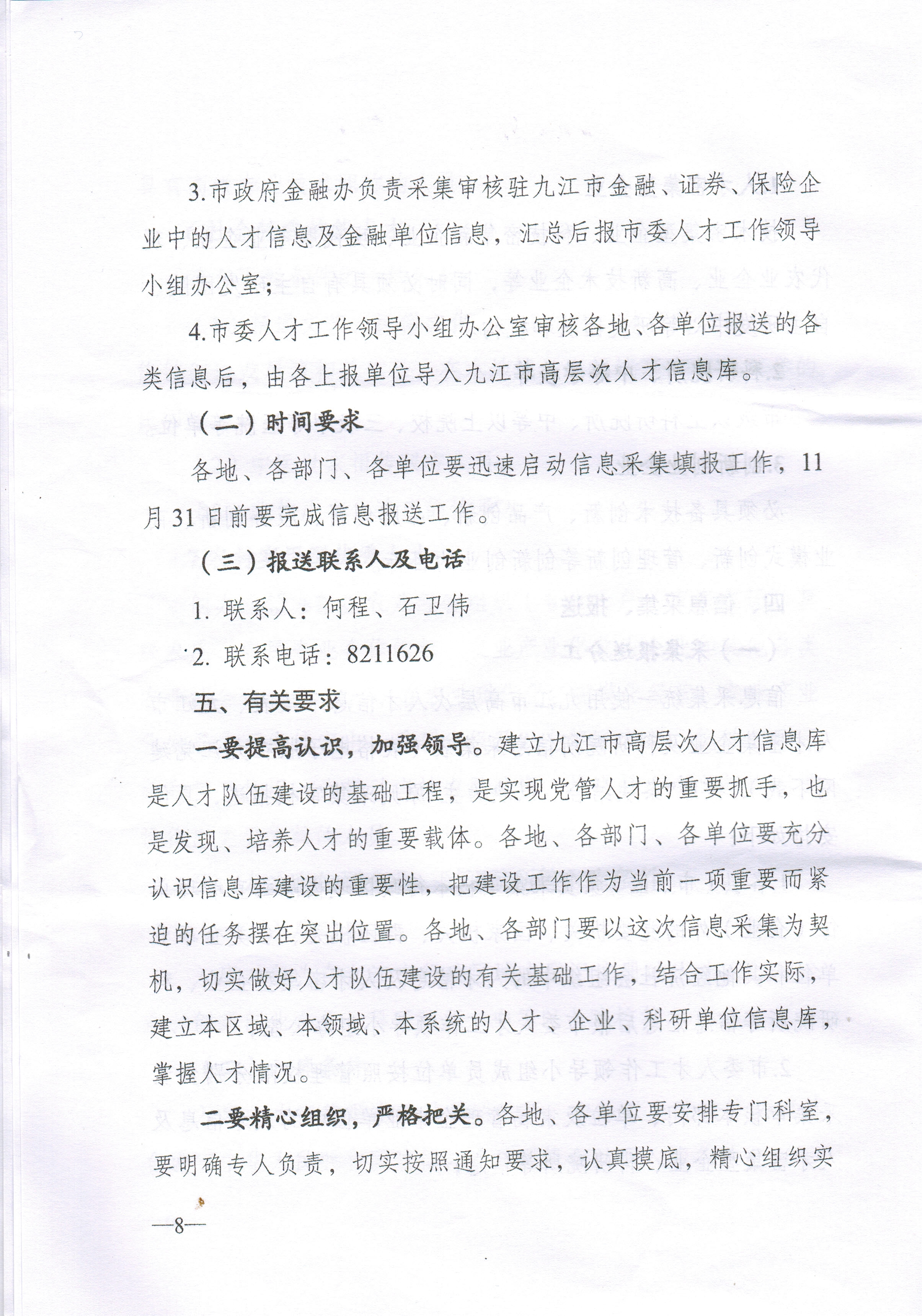 3、申报材料同时以纸质形式和电子文档形式报送。《九江市高层次人才信息采集表》电子文档统一用word格式。纸质文档由各部门统一收集审核后报送组织人事处1013办公室;电子文档统一发送至rsc2018@126.com邮箱,文档名称请统一格式为:部门名称+九江市高层次人才信息采集表。