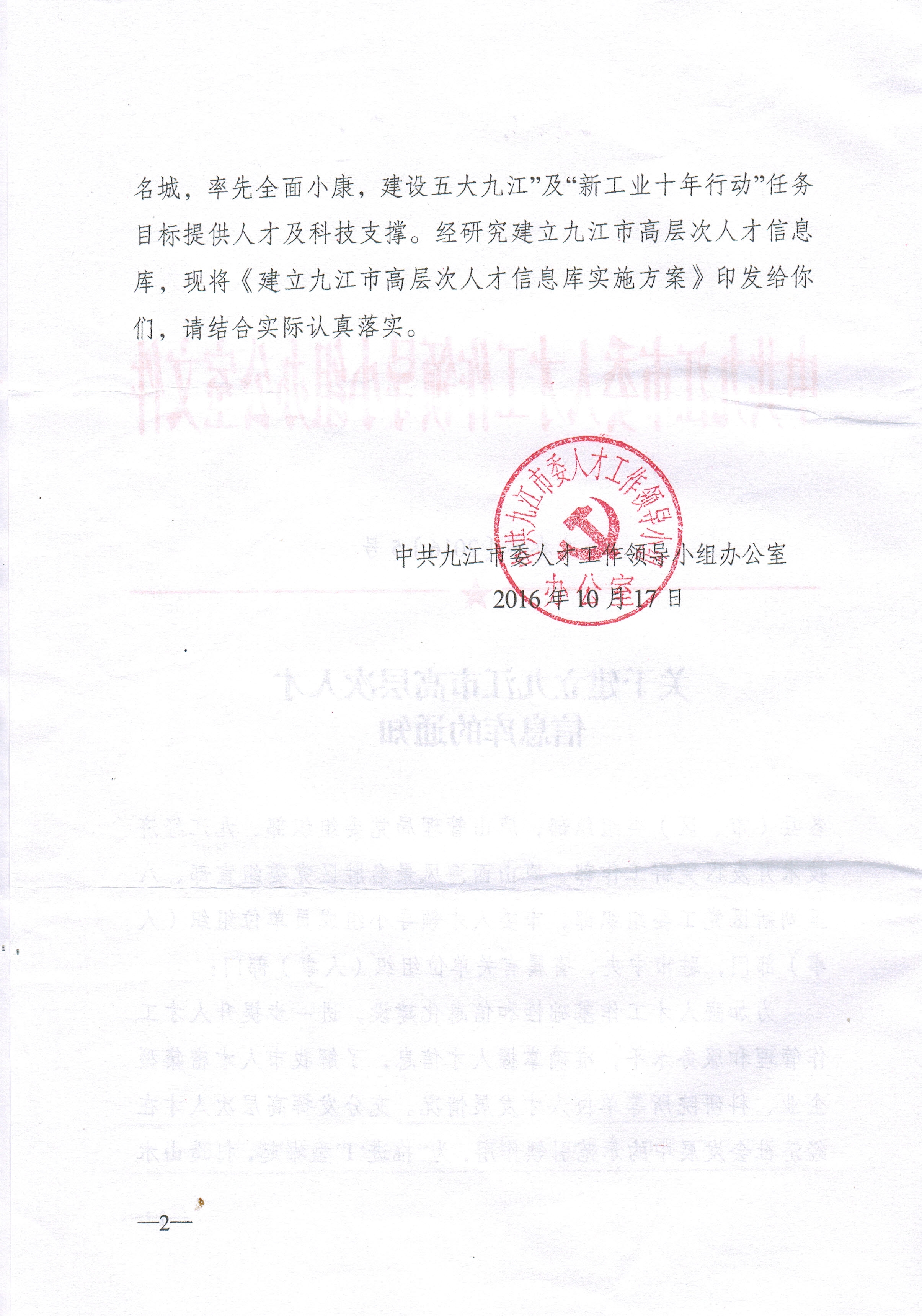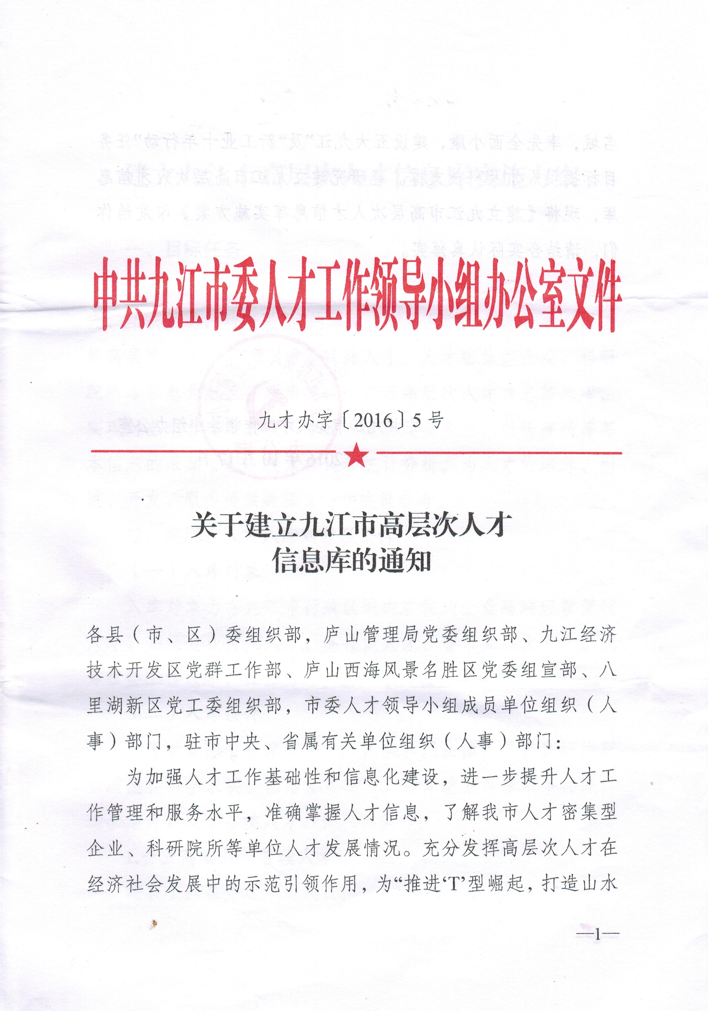 附件:中共九江市委人才工作领导小组办公室《关于建立九江市高层次人才信息库的通知》