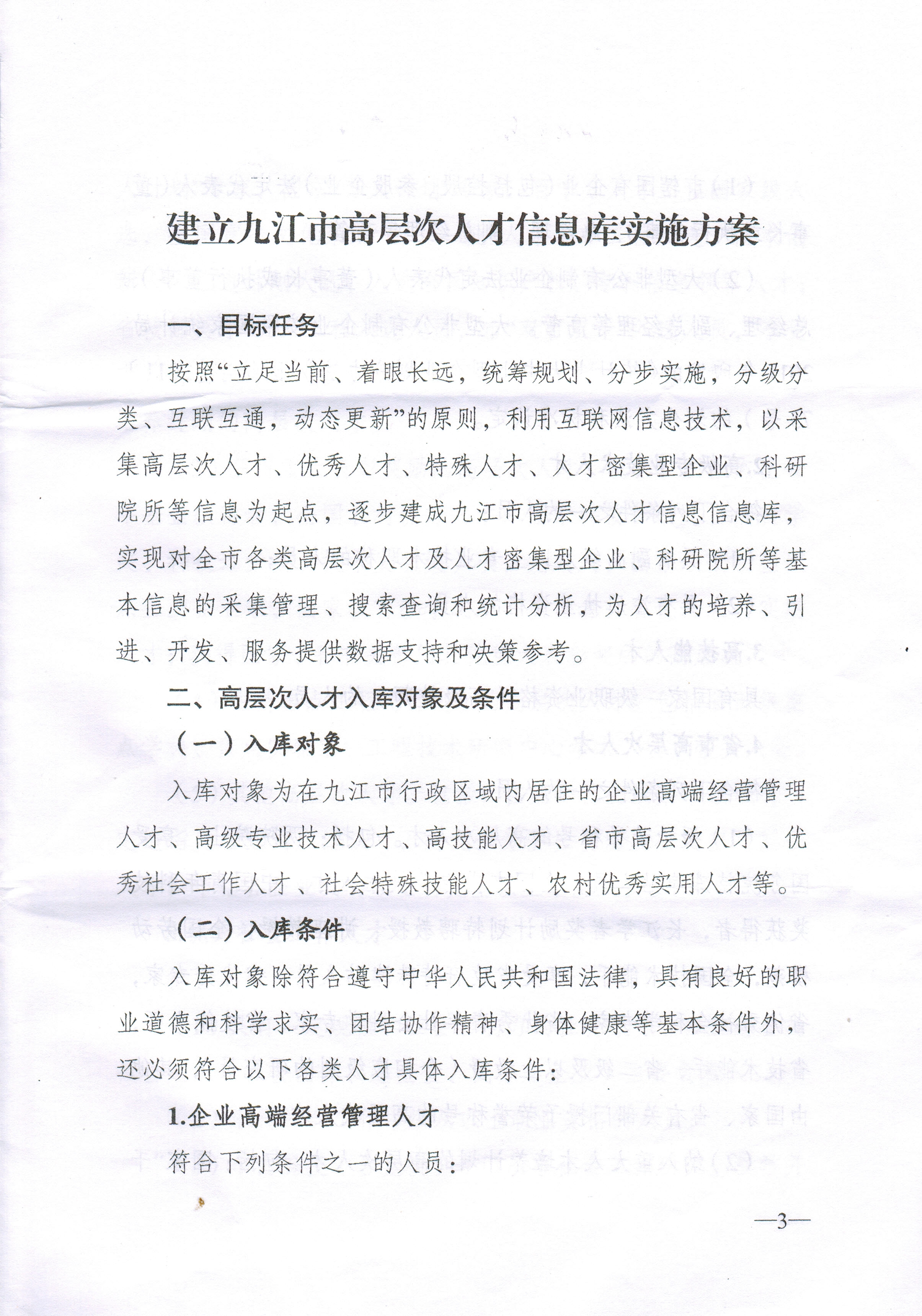 入库对象为在九江市行政区域内居住的高级专业技术人才、高技能人才、省市高层次人才、优秀社会工作人才、社会特殊技能人才、农村优秀实用人才等。