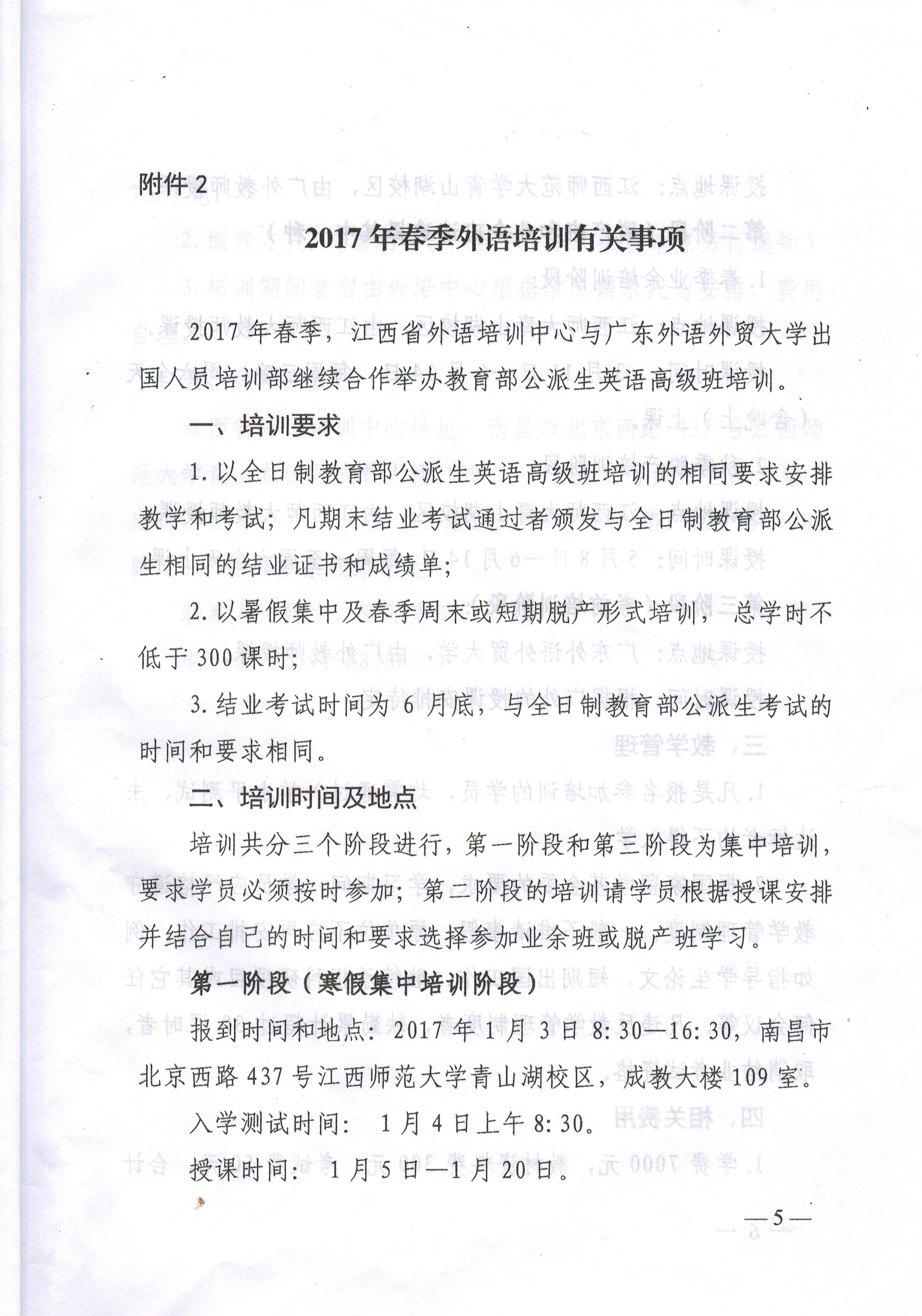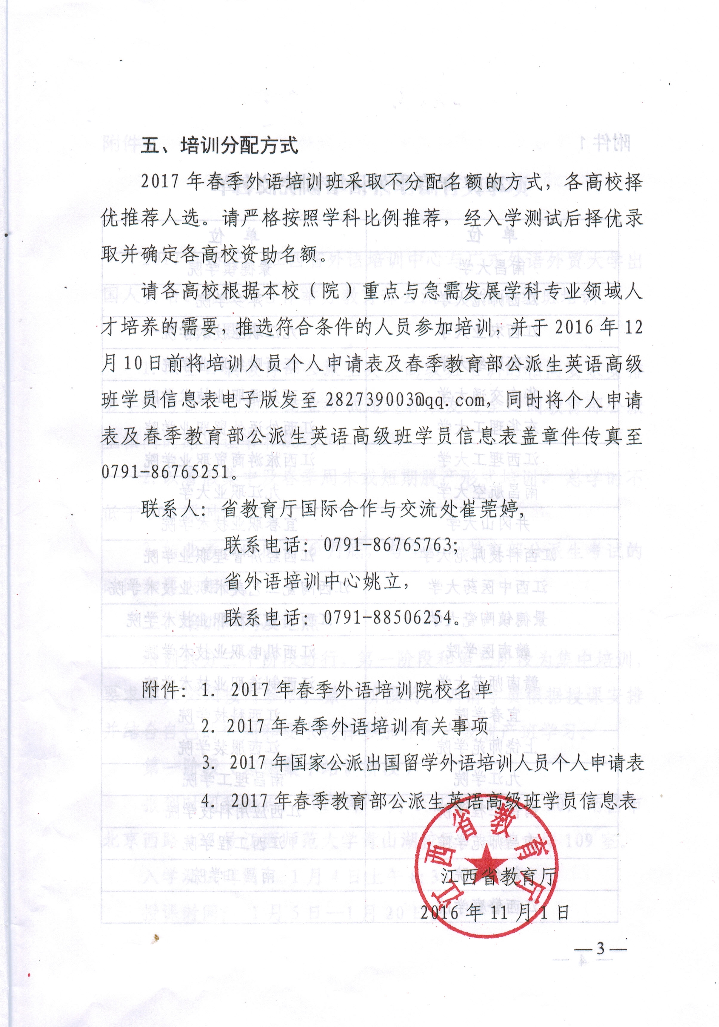 根据江西省教育厅《关于推荐中青年教师参加国家公派出国留学申请预备人选2017年春季外语培训的通知》(赣教外函﹝2016﹞158号)要求,现将有关事项通知如下: