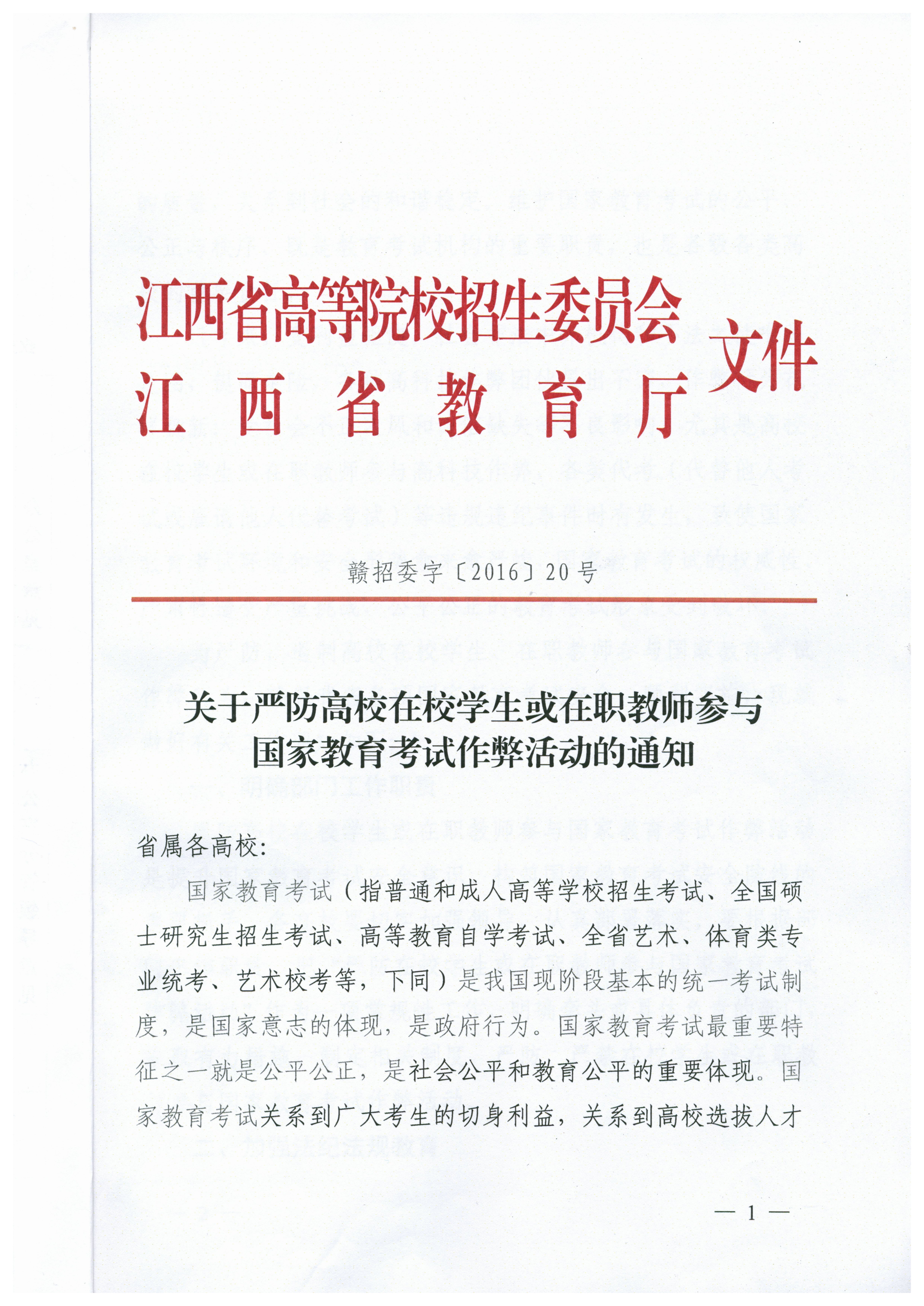 为严防、遏制bat365在职教师参与国家教育考试作弊行为,确保各项国家教育考试安全、顺利实施,现将江西省高等院校招生委员会和江西省教育厅《关于严防高校在校学生或在职教师参与国家教育考试作弊活动的通知》(赣招委字﹝2016﹞20号)文件通知给你们,请学院各部门组织宣传学习,严格遵照文件要求执行。