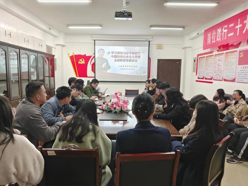 为学习贯彻习近平新时代中国特色社会主义思想,深入学习习近平总书记在主题教育工作会议上的重要讲话精神。4月25日下午,工商管理学院在综合楼903组织召开“学习贯彻习近平新时代中国特色社会主义思想”专题会议。会议由工商管理学院党总支副书记赵新村主持,学院全体教职工参加会议。