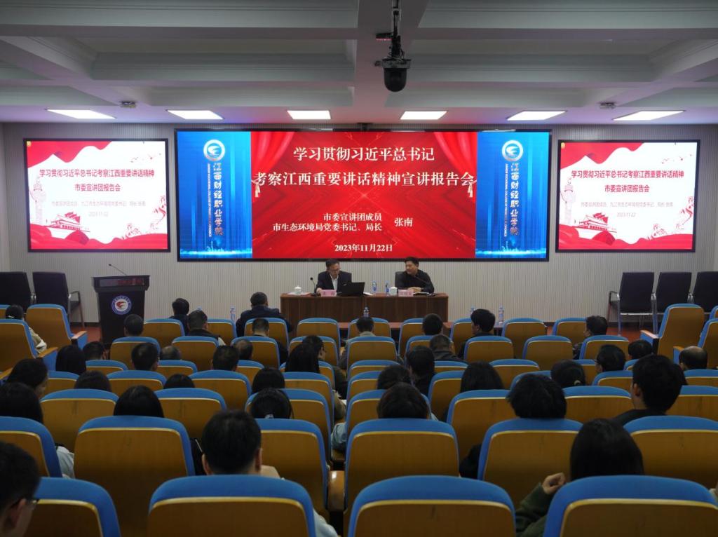 11月22日,学习贯彻习近平总书记考察江西重要讲话精神市委宣讲团在bat365宣讲,市委宣讲团成员、市生态环境局党委书记、局长张南作宣讲报告。校党委书记刘彪文主持报告会。全体在家校领导、中层以上干部、教师党员以及学生代表300余人参会。