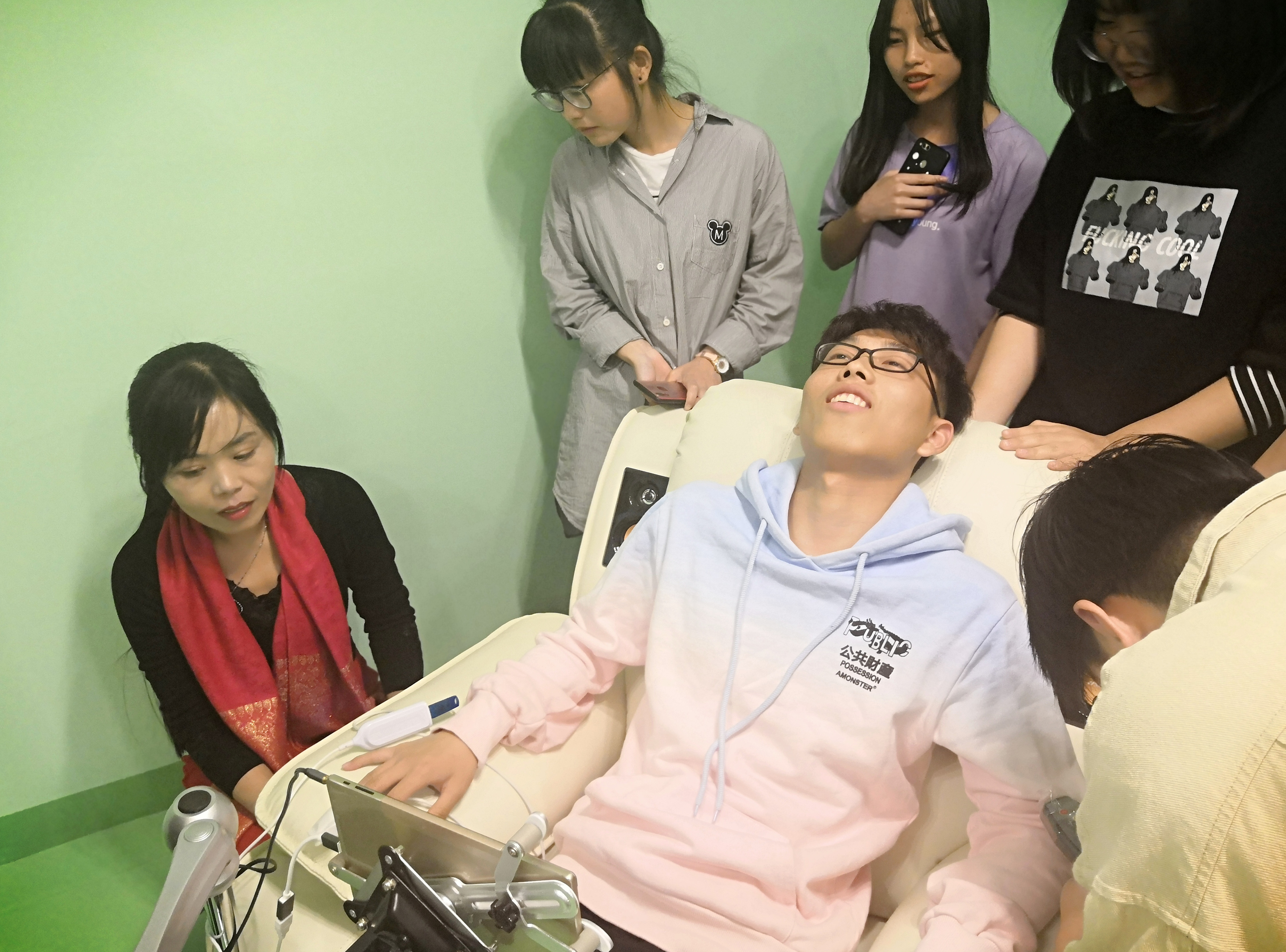 中心主任王艳红老师带领同学们体验了扔毛线球、识图排数字、心有千千结等小游戏,在做中学,让同学们更加深刻体验到人际关系是如何错综复杂,而我们又该如何团结协作。为了让同学们更加的了解心理健康中心的具体功能,老师带领大家一一参观了生物反馈治疗室、情绪发泄室、沙盘游戏室等地方,并带领大家体验各种心理疗法以及仪器。