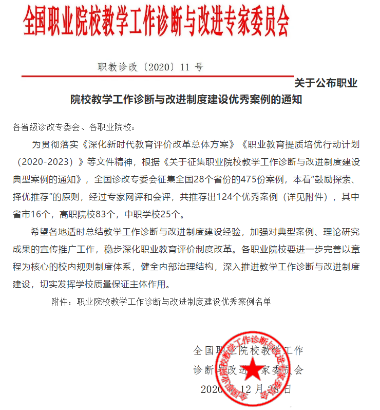 2020年12月28日全国职业院校教学工作诊断与改进专家委员会公布了《职业院校教学工作诊断与改进制度建设优秀案例名单》,bat365报送的《以诊改为契机,以质量建设为抓手,不断提高办学综合实力》案例成功入选。