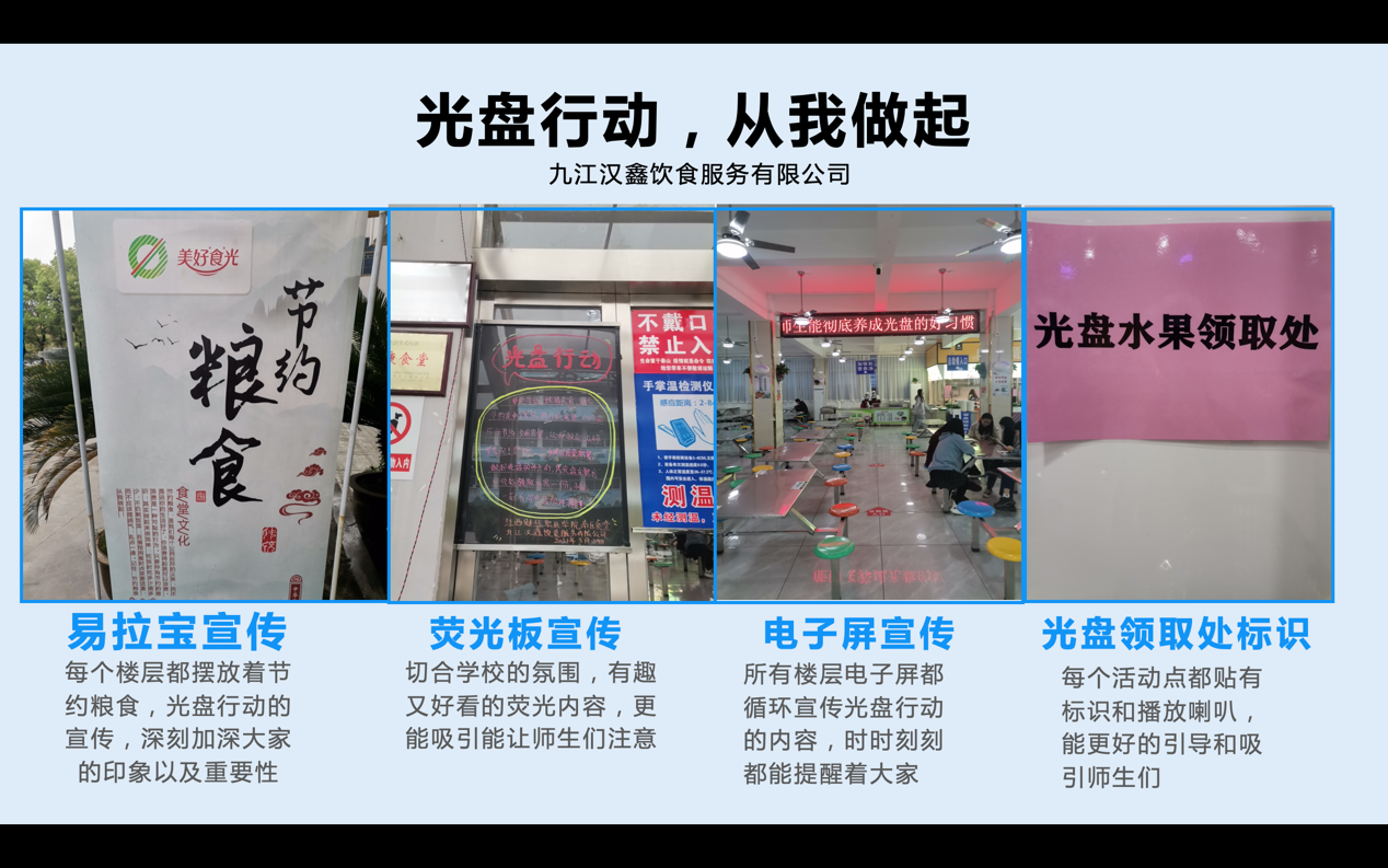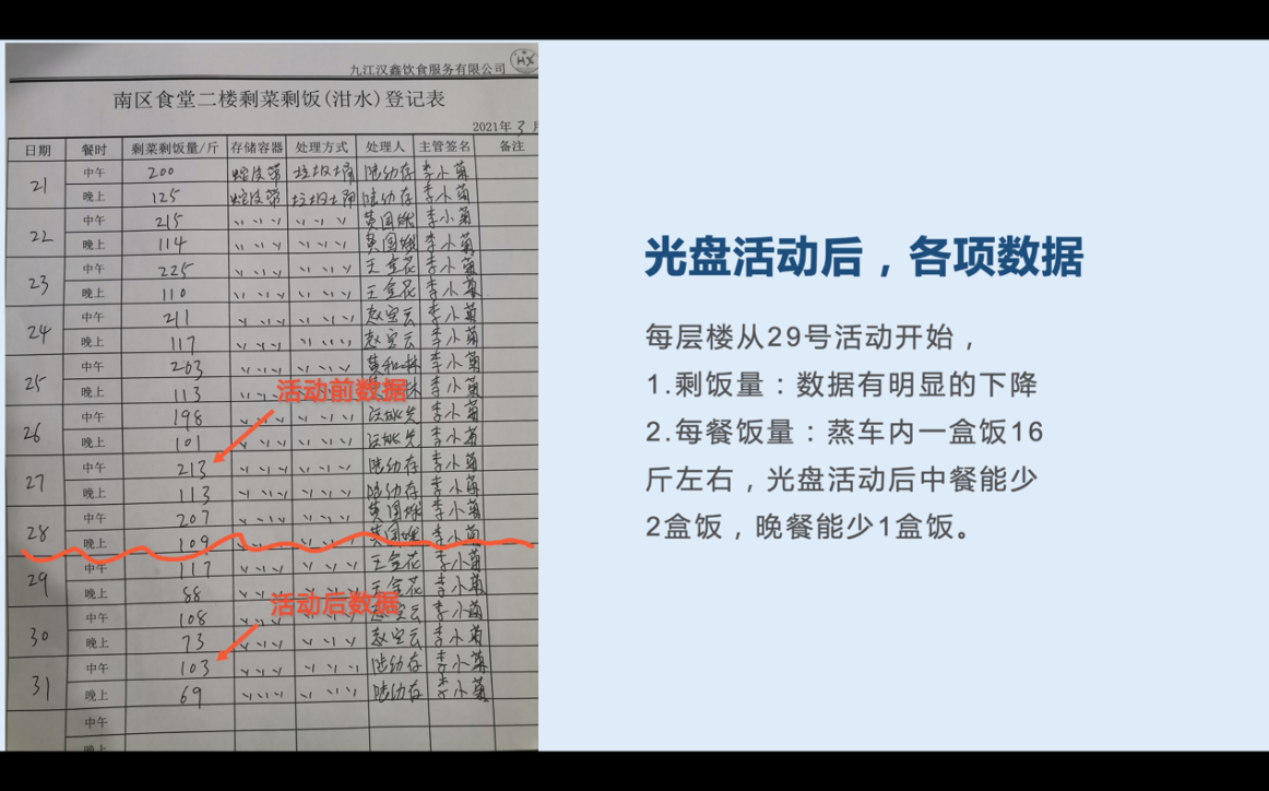 该活动开展以来,通过宣传、引导和教育,师生反应良好,主动按需取餐,主动光盘,南区食堂的餐厨垃圾明显减少,剩饭菜现象得到了明显改善。