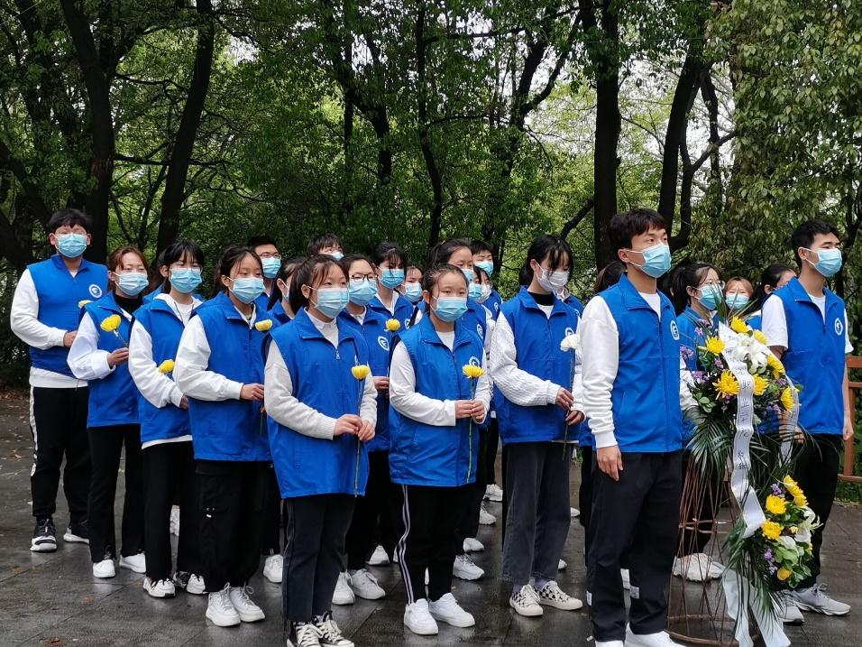 2021年4月3日上午,全体青年志愿者队伍整齐,庄严肃立,在革命烈士纪念塔前向为祖国解放事业英勇牺牲的革命烈士们默哀。在沉重的氛围中,同学们缓缓走向革命烈士纪念塔,绕塔一周并敬献鲜花,以表达深深的崇敬和怀念之情。