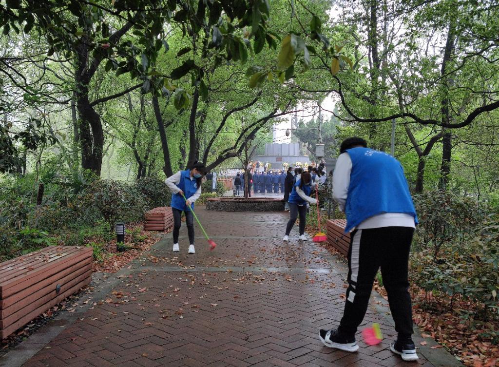 纪念塔前落叶堆积,志愿者们手持扫把、簸箕等工具在铺满落叶的道路上忙碌起来,仔细清扫着每个角落,为革命烈士们营造一个优美整洁的面貌环境。