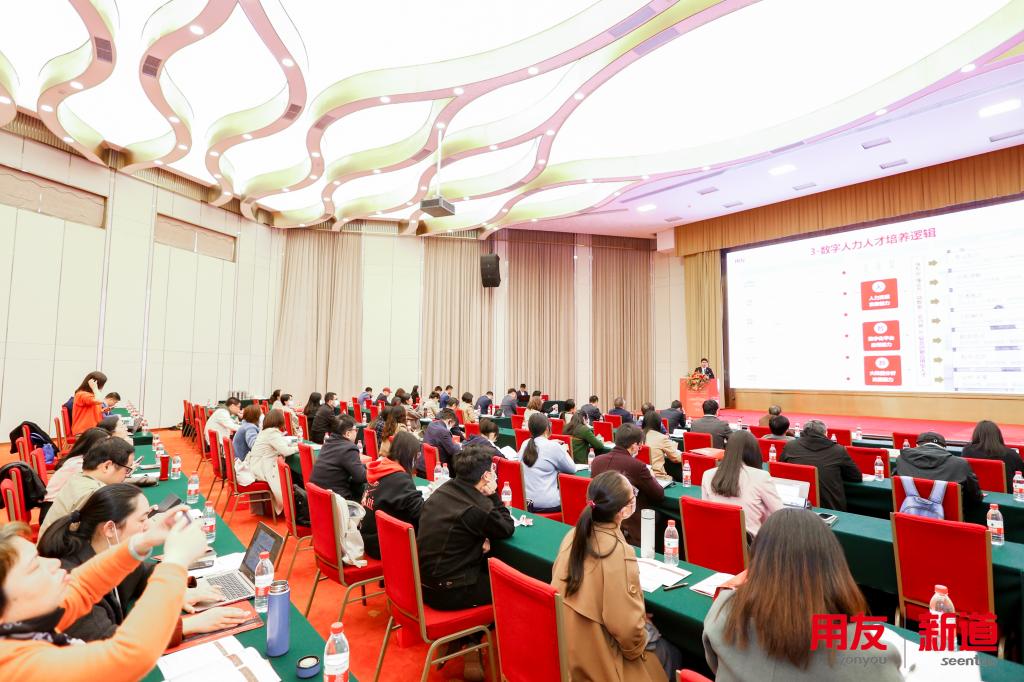 会上,浙江省经营管理研究会产教融合专业委员会秘书长张雪平、用友网络科技股份有限公司浙江区副总经理毛雨泊、新道科技股份有限公司副总裁贾大明、圣奥科技股份有限公司人力资源总监尹志远、浙江工商大学教务处处长厉小军、浙江金融职业学院副校长郭福春、新道科技股份有限公司专家陈涛、眭召强等分别作主题发言,从行业、企业、高校等不同背景解读了新时期数智人才培养的社会需求和实施路径。