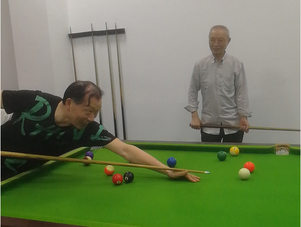 参加台球比赛的老同志以球会友,在打出许多精彩击球的同时,也增进了相互之间的沟通和了解。
