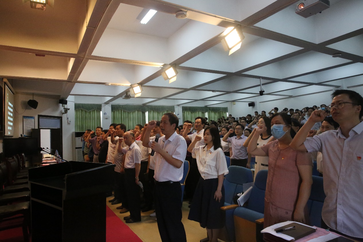 大会在雄壮的国歌声中拉开帷幕。在校党委书记林火平的领誓下,老党员重温了入党誓词,新党员进行了入党宣誓。