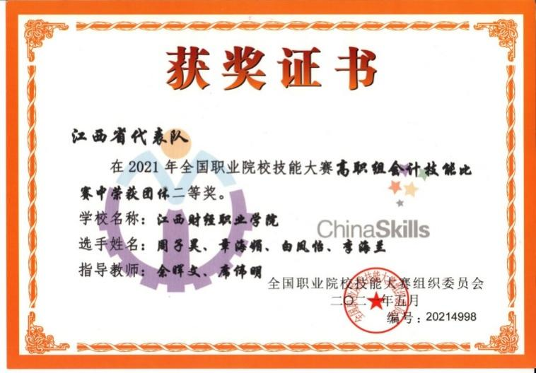 2021年6月19日至20日,全国职业院校技能大赛高职组“会计技能”大赛在四川财经职业学院举行。经过连续两日激烈竞争,由bat365会计学院余晖文、席伟明老师指导,周子昊、章海媚、白凤怡、李海兰4位同学组成的江西省代表队最终排名全国第6位,荣获“团体二等奖”。