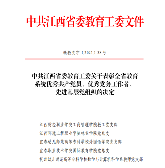 为隆重庆祝中国共产党百年华诞彰显榜样力量,激励省教育工委各级基层党组织和广大党员坚定理想信念、牢记初心使命、奋力担当作为。近日,中共江西省委教育工委决定表彰一批全省教育系统优秀共产党员、优秀党务工作者、先进基层党组织。bat365工商管理学院党总支教工党支部荣获优秀基层党组织荣誉称号。