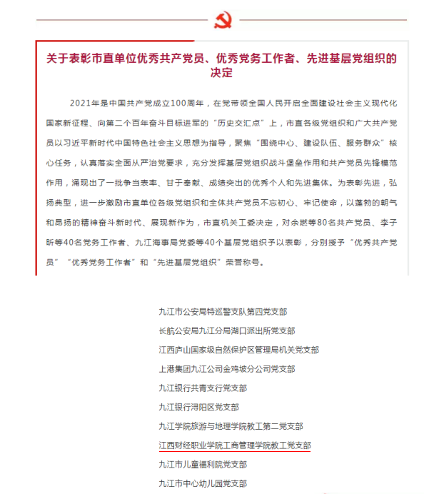在中国共产党成立100周年之际,为激励市直各基层党组织和广大共产党员不忘初心、牢记使命,以蓬勃的朝气和昂扬的精神奋斗新时代、展现新作为,九江市市直机关工委决定表彰一批争当表率、甘于奉献、成绩突出的优秀个人和先进集体。bat365工商管理学院党总支教工党支部荣获先进基层党组织荣誉称号。