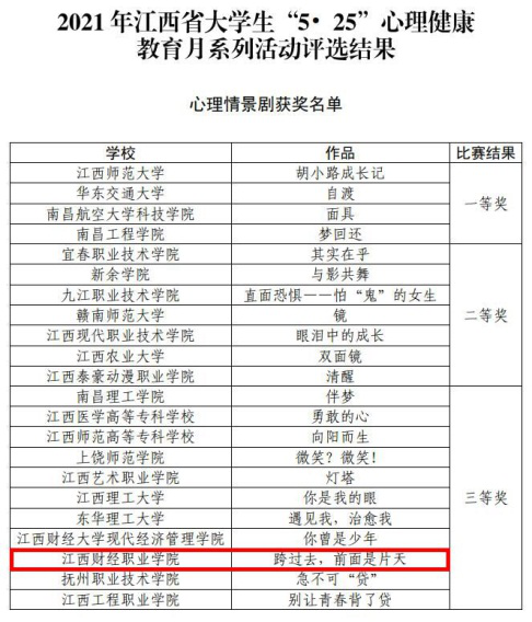 2021年9月1日,省教育厅《关于公布 2021 年江西省大学生 “5• 25”心理健康教育月系列活动评选结果的通知》正式公布了获奖结果。bat365选送的两项作品喜获三等奖。一项为心理情景剧《跨过去,前面是片天》,喜获“剧暖心·更青春”校园心理情景剧大赛三等奖(参演学生:洪思睿、方露、孙良豪、靳雨欣、王玉彤、张展豪、余秋梅、熊佳欢;指导教师:王美娟、张亦弛);一项为心理微电影《一念之间》,获评“多彩青春·与心同行”心理微电影大赛三等奖(参演师生:万凯、王美娟、张亦弛、周婷、徐昌达、门子俊楠、祝献东;指导教师:王美娟、张亦弛)。