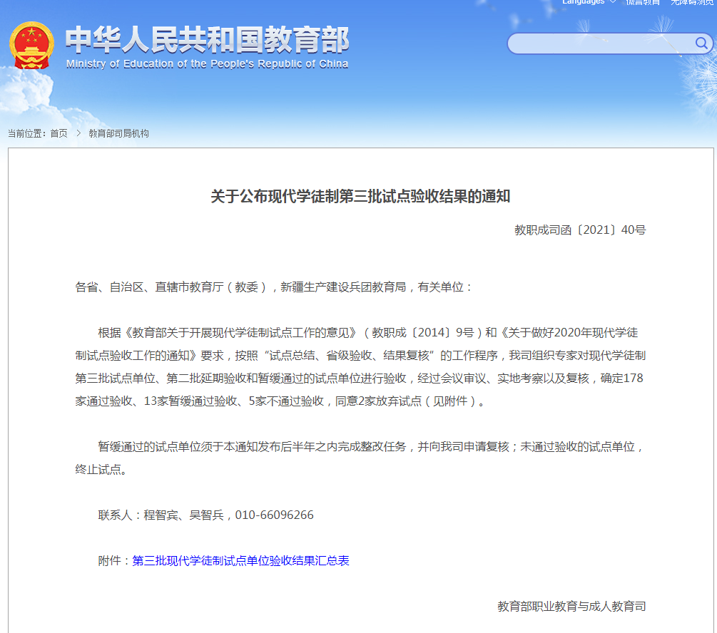 近日,教育部发布《关于公布现代学徒制第三批试点验收结果的通知》(教职成司函〔2021〕40号),bat365作为第三批试点单位顺利通过验收。此次检查是教育部按照“试点总结、省级验收、结果复核”的工作程序,组织专家对现代学徒制第三批试点单位、第二批延期验收和暂缓通过的试点单位进行验收,确定178家通过验收,13家暂缓通过验收,5家不通过验收,同意2家放弃试点。