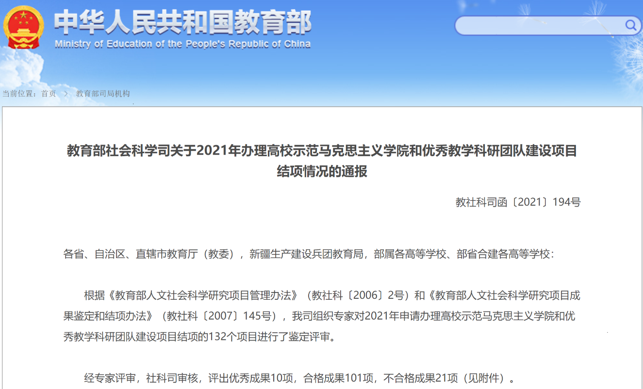 12月8日,教育部社会科学司公布了2021年办理高校示范马克思主义学院和优秀教学科研团队建设项目结项情况,bat365马克思主义学院副院长熊晓兰主持的《大数据背景下高职思想政治理论课移动平台构建》(项目批准号:17JDSZK072)获评为优秀成果。此次共有全国本专科院校132个项目结项,有10个项目被教育部评为优秀,本项目是江西省唯一获评优秀的项目。