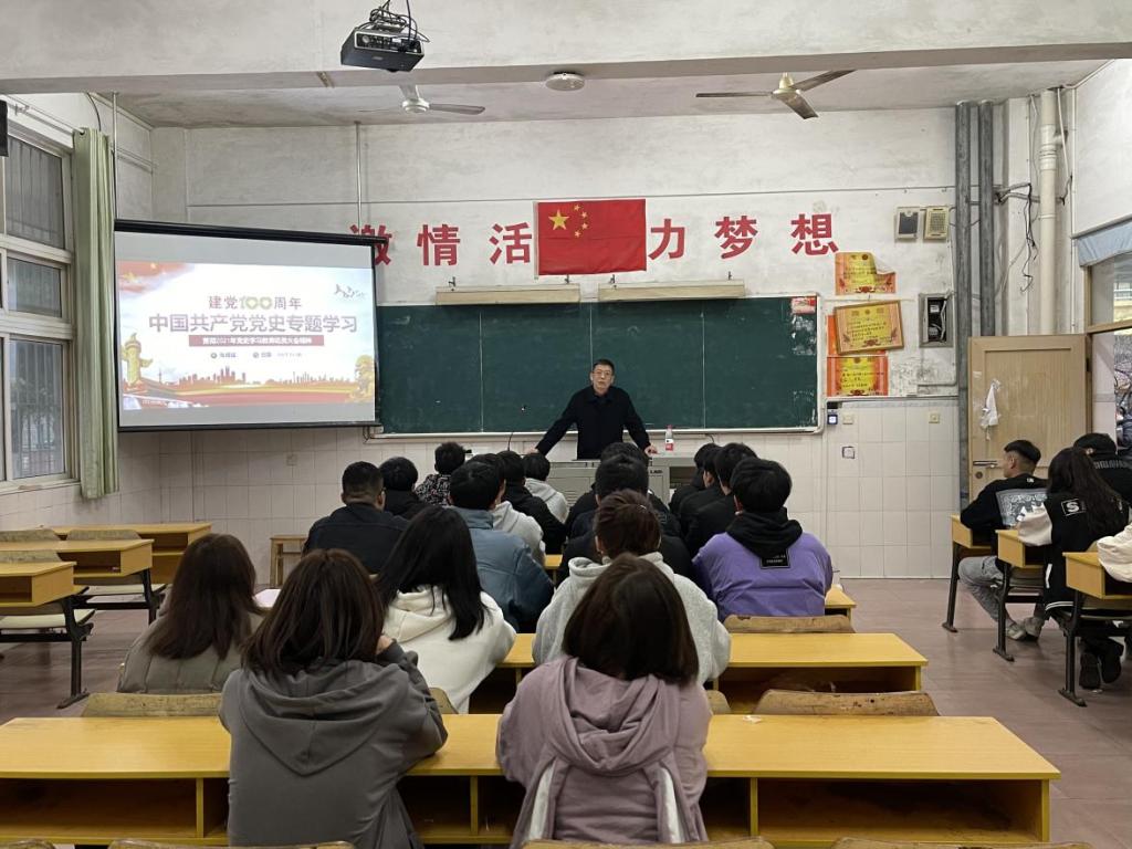 在教学楼104教室,张成斌教授召开了以“学习百年党史,凝聚奋进力量”为主题的班会。会上,张成斌带同学们回顾了中国共产党的百年奋斗史,从“开天辟地”的新民主主义革命时期讲述到“改天换地”的社会主义革命时期,从“翻天覆地”的改革开放时期谈论到当今“惊天动地”的中国特色社会主义新时代。班会的最后,张成斌指出青年大学生是整个社会力量中最积极、最有生气的力量,国家的希望在青年,民族的未来也同样在青年,希望同学们保持信念、怀揣梦想,为祖国日后的繁荣昌盛做出贡献。