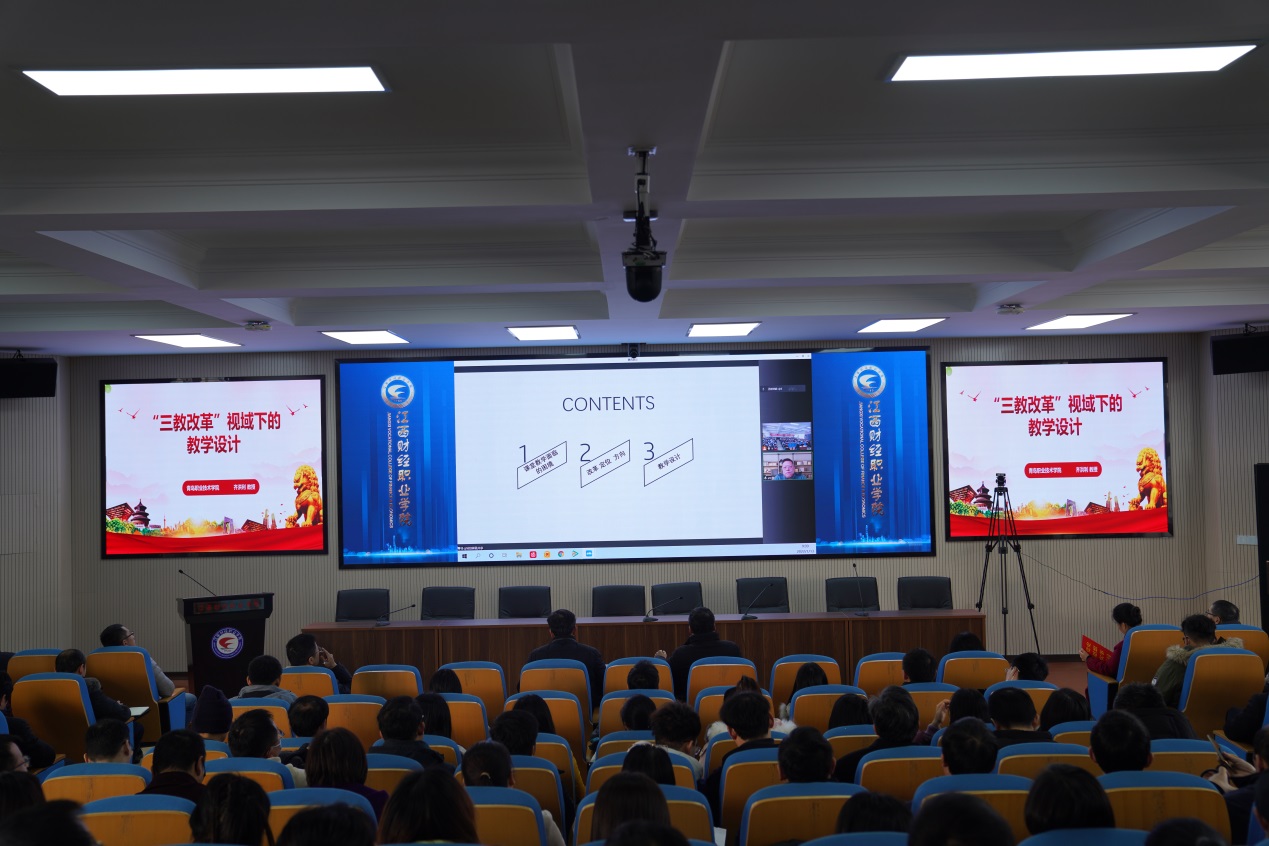 13日上午,国家高层次特殊支持计划领军人才、青岛职业技术学院齐洪利教授通过视频连线为大家作了《”三教改革”视域下的教学设计》的精彩报告,报告分为“三教改革的动因与趋势”“改革:定位与方向”“教学设计”三部分内容。讲座上,齐洪利教授首先针对课堂教学的现状与面临的困境,深入剖析了“三教改革”的动因,随后齐教授重点就“三教改革”的主体(谁来教)、载体(教什么)和怎么教(路径)与大家进行了深入探讨,并分析了职业教育的趋势与定位;最后,齐教授介绍了教学设计的典型模式,并举例说明了各种模式的教学实现过程。讲座内容丰富、例证详实,着眼当前、面向未来,既有理论分析,又有实践案例,有很高的学术价值和现实意义,极大地开拓了教师视野,引发广大教师对“三教改革”的深思。