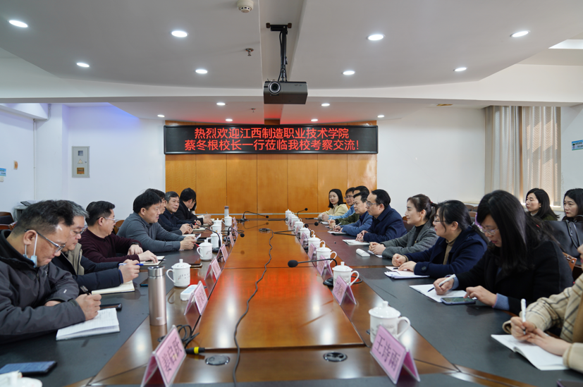 3月2日,江西制造职业技术学院校长蔡冬根一行11人来bat365考察交流。校长刘彪文、常务副校长何先应、党委委员邱家明热情接待了蔡冬根校长一行,学校相关职能部门负责人参加交流座谈会。