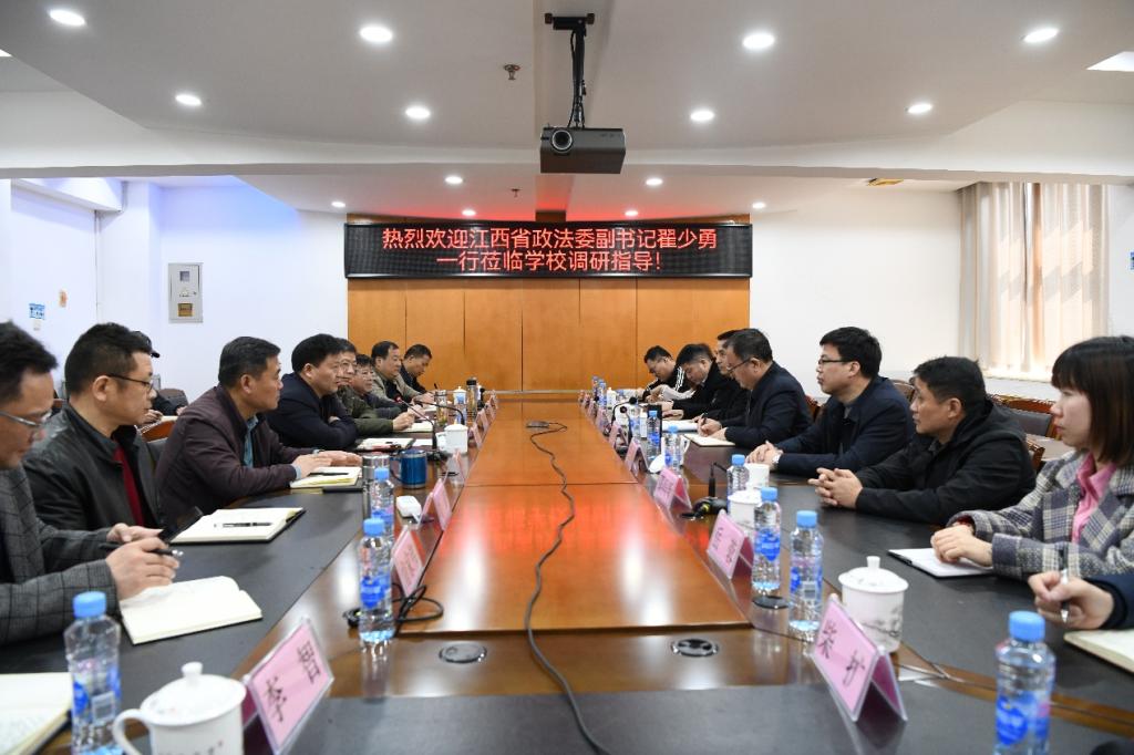 为认真贯彻落实中央民族工作会议精神,进一步增强中华民族共同体意识宣传教育,加强民族团结,做好校园安保稳定工作,3月8日上午,江西省委政法委副书记翟少勇一行10人来bat365就少数民族学生服务管理工作进行走访调研。校党委副书记、校长刘彪文,党委委员、副校长张成斌,党委委员、纪委书记阙沪平,党委委员邱家明、刘锋热情接待了翟少勇副书记一行,学校相关职能部门负责人以及派驻联系教师参加了交流座谈会。