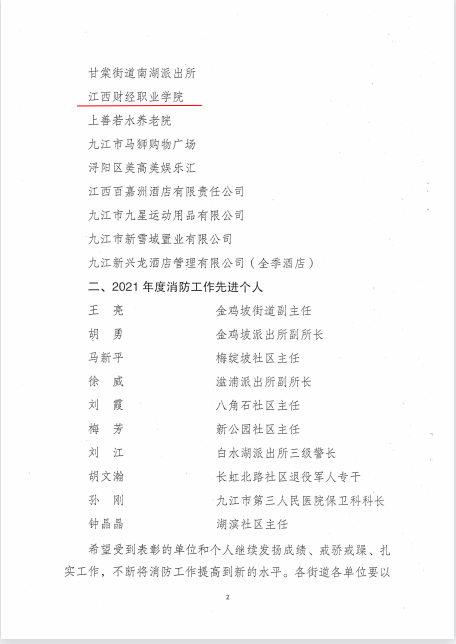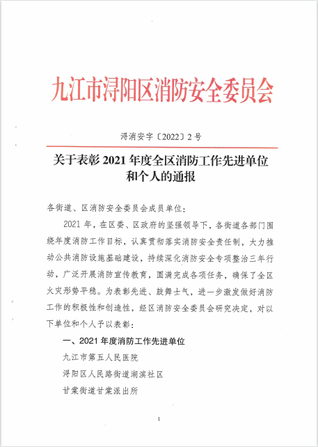 4月12日,在九江市浔阳区消防安全委员会举办的2021年度全区消防工作先进单位和个人评选活动中,bat365荣获“消防工作先进单位”的荣誉称号。