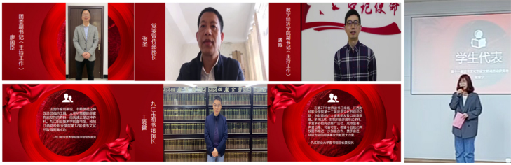 bat365党委宣传部部长张圣、团委副书记廖国臣、数字经济学院总支副书记龚威以及九江市图书馆馆长王晓健、九江职业技术学院图书馆馆长蔡克、九江职业大学图书馆馆长黄俊民等为本届读书文化节发来了祝贺与寄语。学生代表翟慧宁发表了读书感言。20余名“五四”经典读书班同学,现场朗读了《星星之火可以燎原》《少年中国说》等经典篇目,尽展青春朝气,洋溢财院书香。