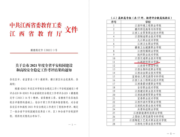 4月8日,省教工委和教育厅印发《关于公布2021年度全省平安校园建设和高校安全稳定工作考评结果的通知》,bat365在全省57所高职高专院校中排名第11名。