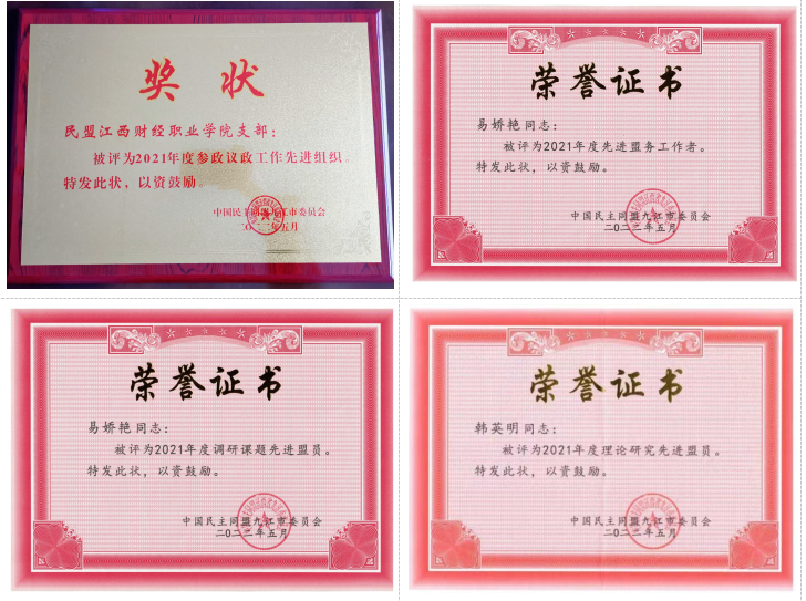 5月10日,民盟九江市委会召开第十八届四次全体(扩大)会议。会议表彰了2021年基层组织先进集体、先进盟务工作者和先进盟员、民盟公益微课堂先进个人等。bat365民盟支部因工作扎实、业绩突出,被民盟九江市委会授予“2021年度参政议政工作先进组织”荣誉称号,易娇艳、韩英明分别获“先进盟务工作者”“调研课题先进盟员”“理论研究先进盟员”称号。