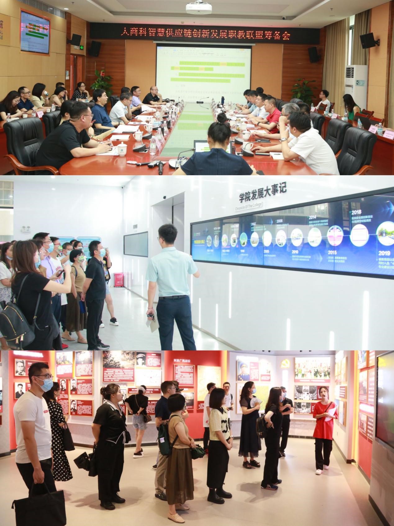 7月8日上午,与会代表赴广西职业技术学院参观交流。先后参观了科技创新成果展示体验中心、智慧物流实训室、冷链物流实训中心。校方负责人为大家详细介绍了广职院的双高成果展、发展简史、校企合作产教融合历程、物流专业群的建设特色、课程思政的建设。随后,在广职院会议室召开全国大商科智慧供应链创新发展职教联盟筹备会。各个院校代表畅所欲言,对联盟章程的各项细则发表意见,充分交流,达成共识。